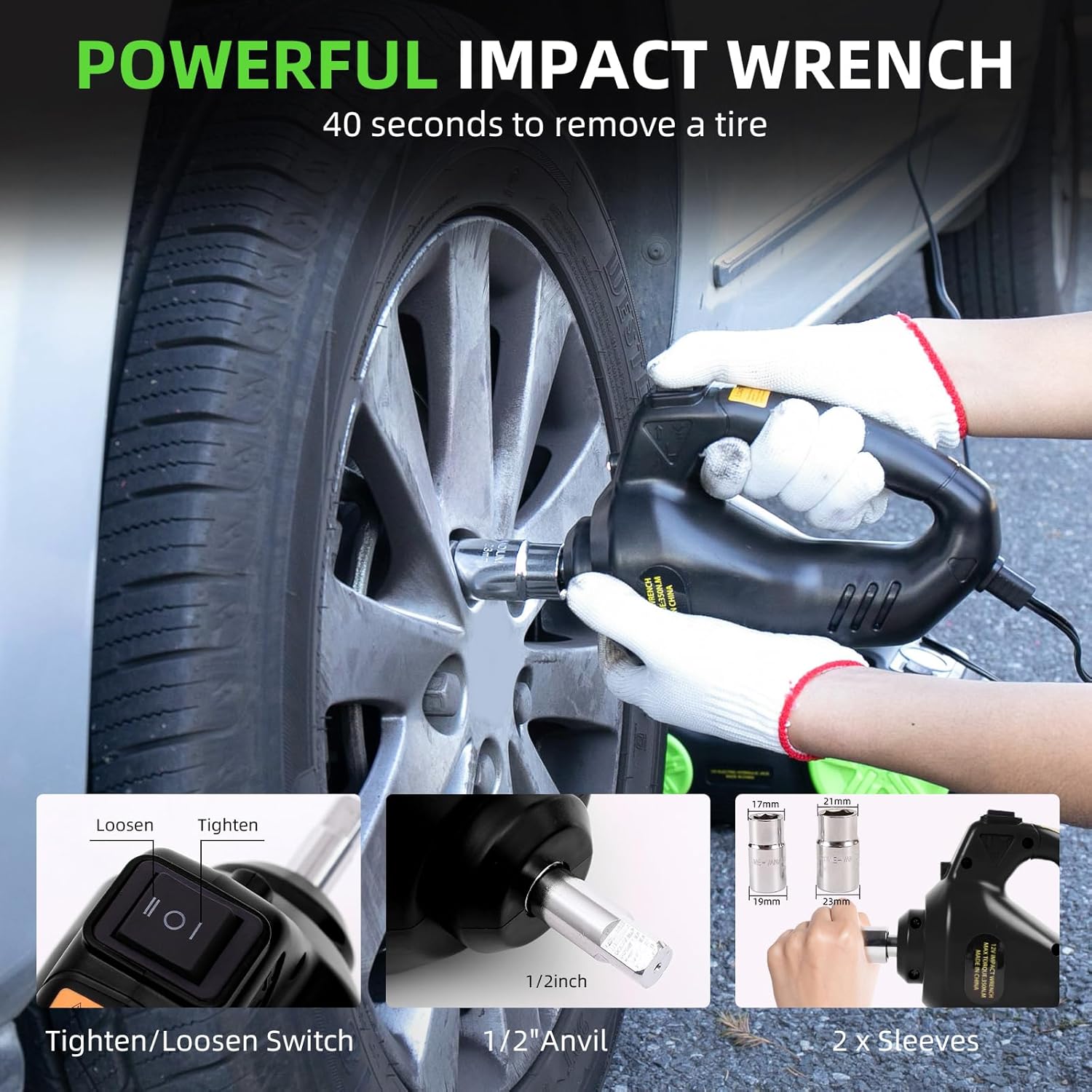 - Powerful Impact Wrench: This car jack kit includes an electric impact wrench with ABS shell, rust-proof steel body, and high-performance copper motor. Delivers low noise, high power, and strong torque for fast bolt removal and 360° rotation