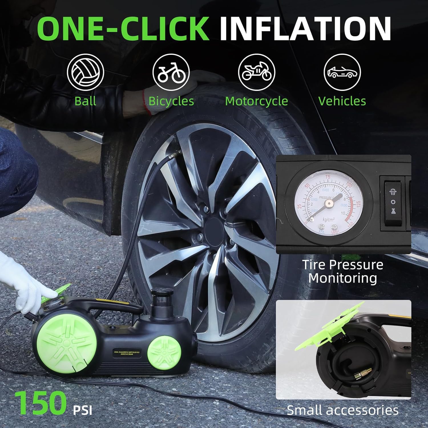 - Versatile Use: This car jack kit integrates lifting, inflation, lighting, and tire removal functions. Its built-in air compressor inflates tires at 35L/min within 2 minutes, while the integrated LED light facilitates tire changes at night