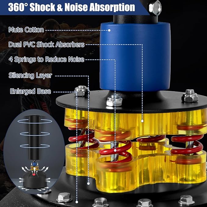 - Shock-Absorbing System: Equipped with a specialized shock absorbing system, the boxing bag minimizes impact and vibrations, reduces noise level and strain on your joints, as well as minimizing the risk of injuries.