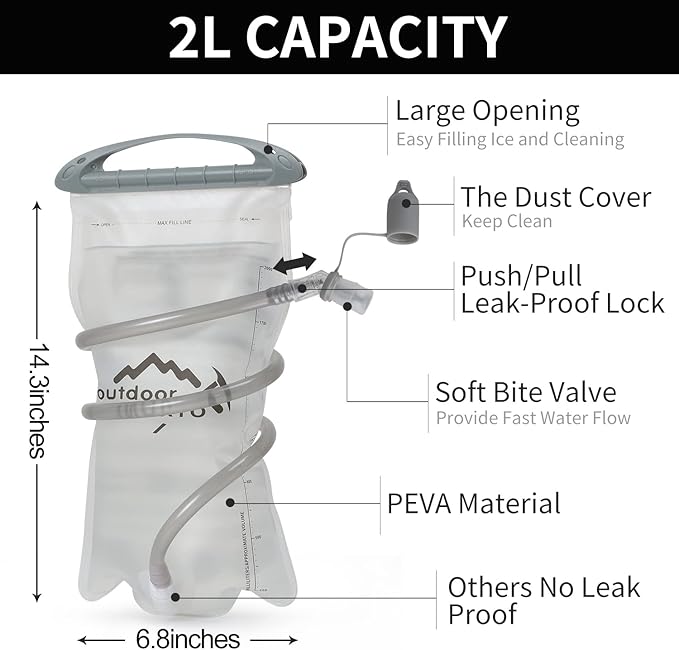 - 🚴【Premium Quality Water Bladder】The Hydration Pack Backpack comes with a 2 liter hydration water bladder and two 250ml soft flask. A switch valve and a cover cap make double leak-proof. Large opening allows quick filling of water and ice and it is easy to clean, the water line (40"length,0.4"diameter) provides a wholesome flow for easy drinking keeps your water tasting fresh, all day. The water temperature is range -20~+50℃.