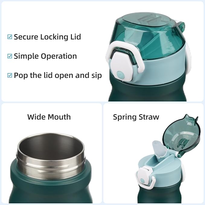 - Equipped with a lockable flip lid and a spring straw, the bottle is leak-proof,left it in your bag without worrying any spills. Simple operation design ensures you Just pop the lid open and sip.Soft silicone spout makes a nice drinking experience.