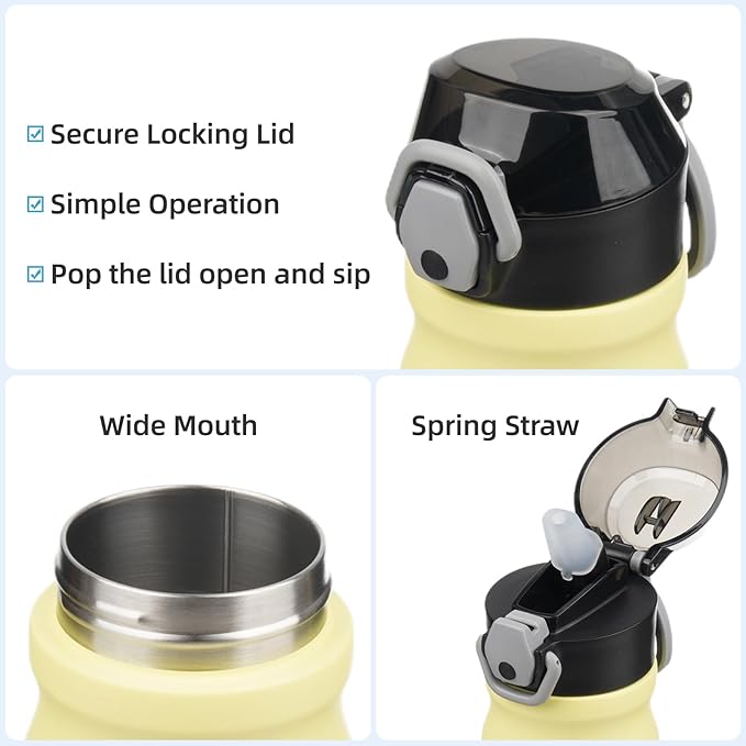 - Equipped with a lockable flip lid and a spring straw, the bottle is leak-proof,left it in your bag without worrying any spills. Simple operation design ensures you Just pop the lid open and sip.Soft silicone spout makes a nice drinking experience.
