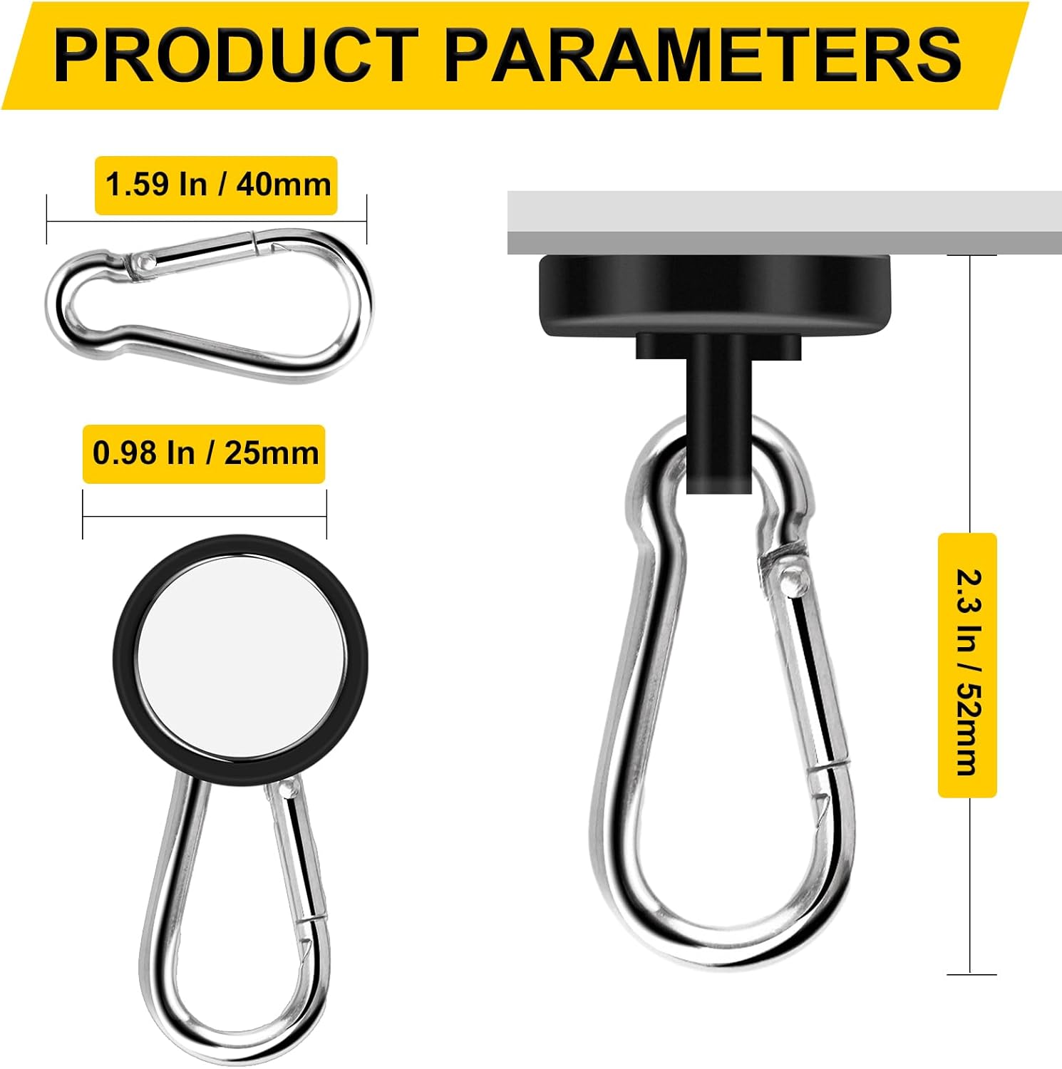 - SUPER DURABLE - These magnetic rotating hooks are plated with Ni+Cu+Ni triple protective layer, which is corrosion and rust resistant, and with the stainless steel carabiner, our hooks are great for outdoor long time use.