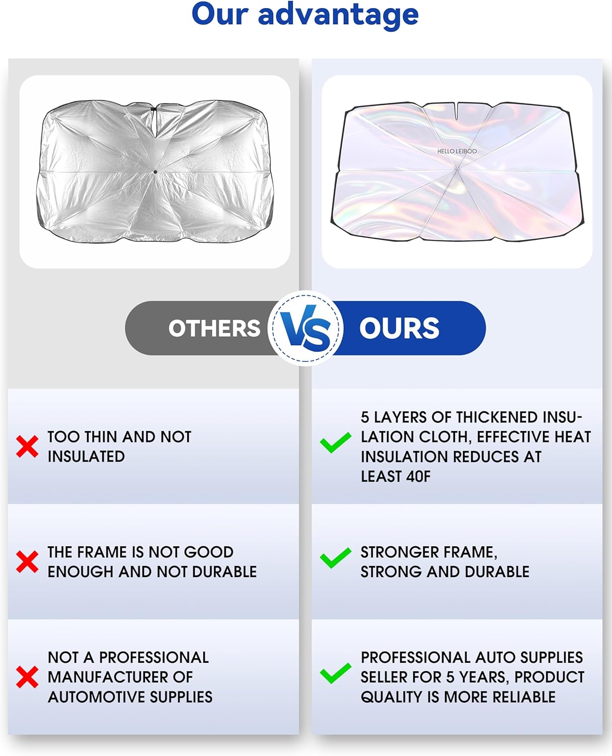 - ใSTORABLE DESIGN SUN SHADE FOR CAR WINDSHIELDใ:This windshield parasol comes with its own storage bag and convenient buckle, you can easily fold and secure the belt, you can easily store the parasol in the glove compartment or trunk when not in use, to avoid debris accumulation. For family or friends with a car, this must be a thoughtful product.If you find that the size does not match after a trial on the car, we promise to send you a more suitable size. Note: Please measure your windshield size before purchasing, If you encounter any problems, feel free to contact us.