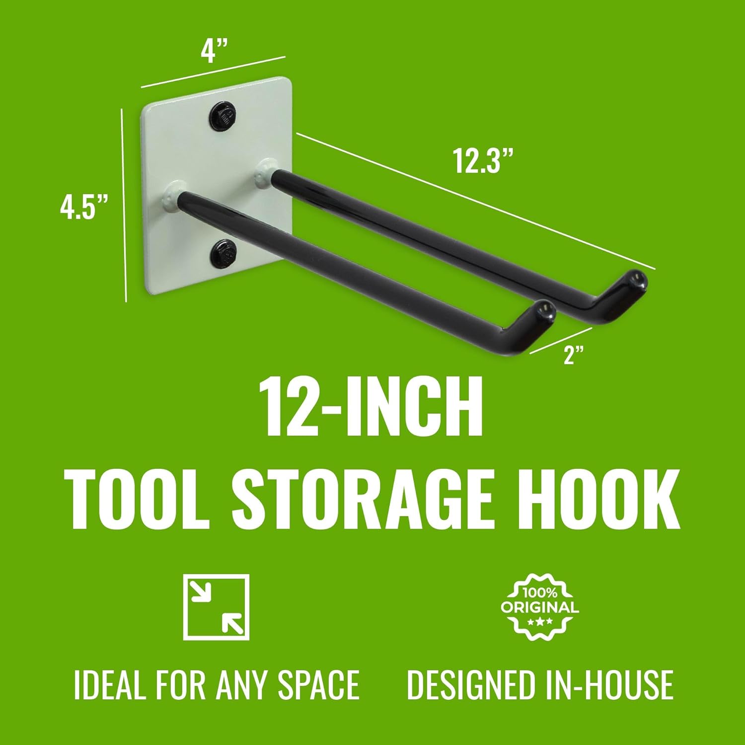 - Garage Wall Hanging Hooks – Universal wall mount storage hook measures 12.3"W x 4.5"D x 4"H to hold shovels, rakes, brooms, mops, garden hoses, extension cords, weed eaters, and much more.