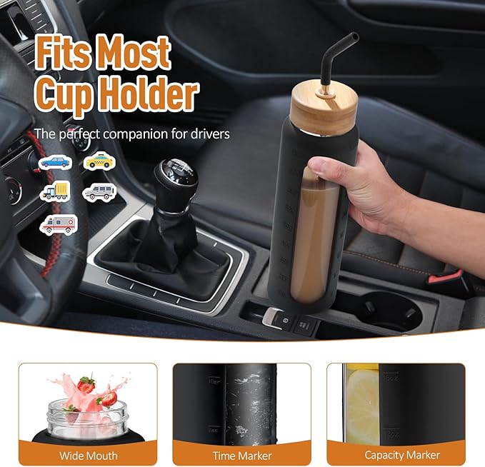 - WATER BOTTLE WITH TIME MARKER - The sleek, modern design coupled with the protective silicone cover makes our Kodrine glass water bottle a fashionable and functional accessory for any setting. The time marker and capacity marker on the sleeve are designed to help you stay hydrated and track your water intake throughout the day. The transparent body allows you to see the liquid level inside the bottle clearly, making it easy to stay on track with your hydration routine.