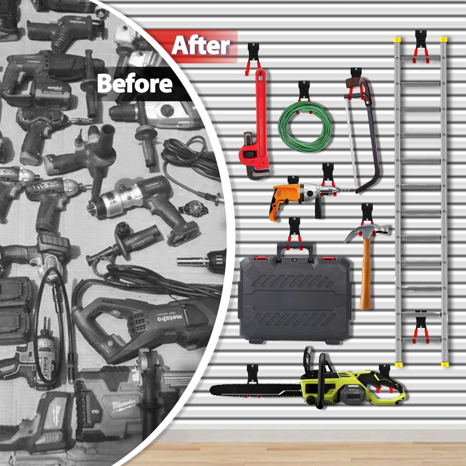 - Heavy Duty Garage Slatwall Accessories Hooks: Slat wall hanging hooks heavy duty are made of thick steel with anti-slip PVC dipping coated preventing the scratching.The sturdy slatwall hooks design provides superior load-bearing capacity, powerful and durable enough to securely hold impact drivers and power tools, such a nice idea tools for hanging