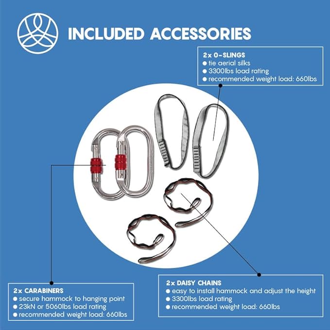 - ✔ BONUS VALUE: Includes complete set of aerial silk (13x9 ft), 2 carabiners, 2 extension straps (3 ft), 2 o-slings, and a manual guide. ⚠️Mounting rig is NOT INCLUDED⚠️