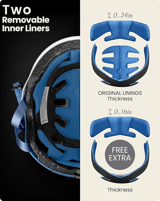 - Extra Removable Lining: Skateboard helmet with two removable liner for different head sizes and easy to wash the sweat away