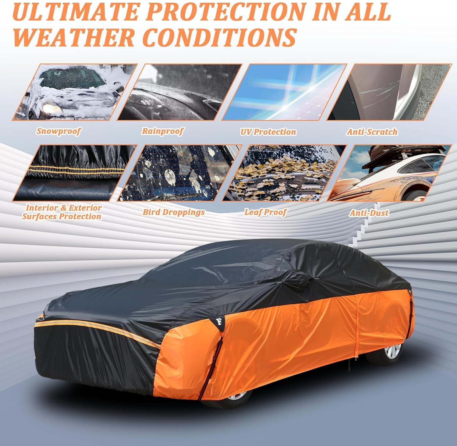 - COMPREHENSIVE PROTECTION: Tecoom full exterior covers are ideal for both indoor and outdoor use, providing protection for your vehicle from UV rays, snow, rain, frost, sand, dust, leaves, branches, animal deposits, and scratches. Whether it is hot summer or cold winter, Tecoom all weather car covers can handle it all. Tecoom car covers will prevent your paint from fading and scratching, protect your interior from discoloration and cracking