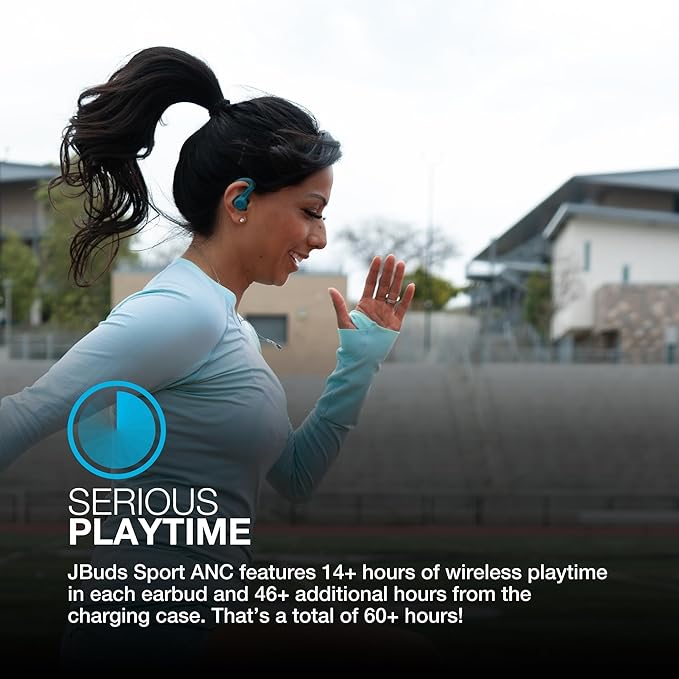 - SERIOUS PLAYTIME: JBuds Sport ANC features 14+ hours of wireless playtime in each earbud and 46+ additional hours from the charging case. That’s 60+ total hours of Bluetooth playtime!