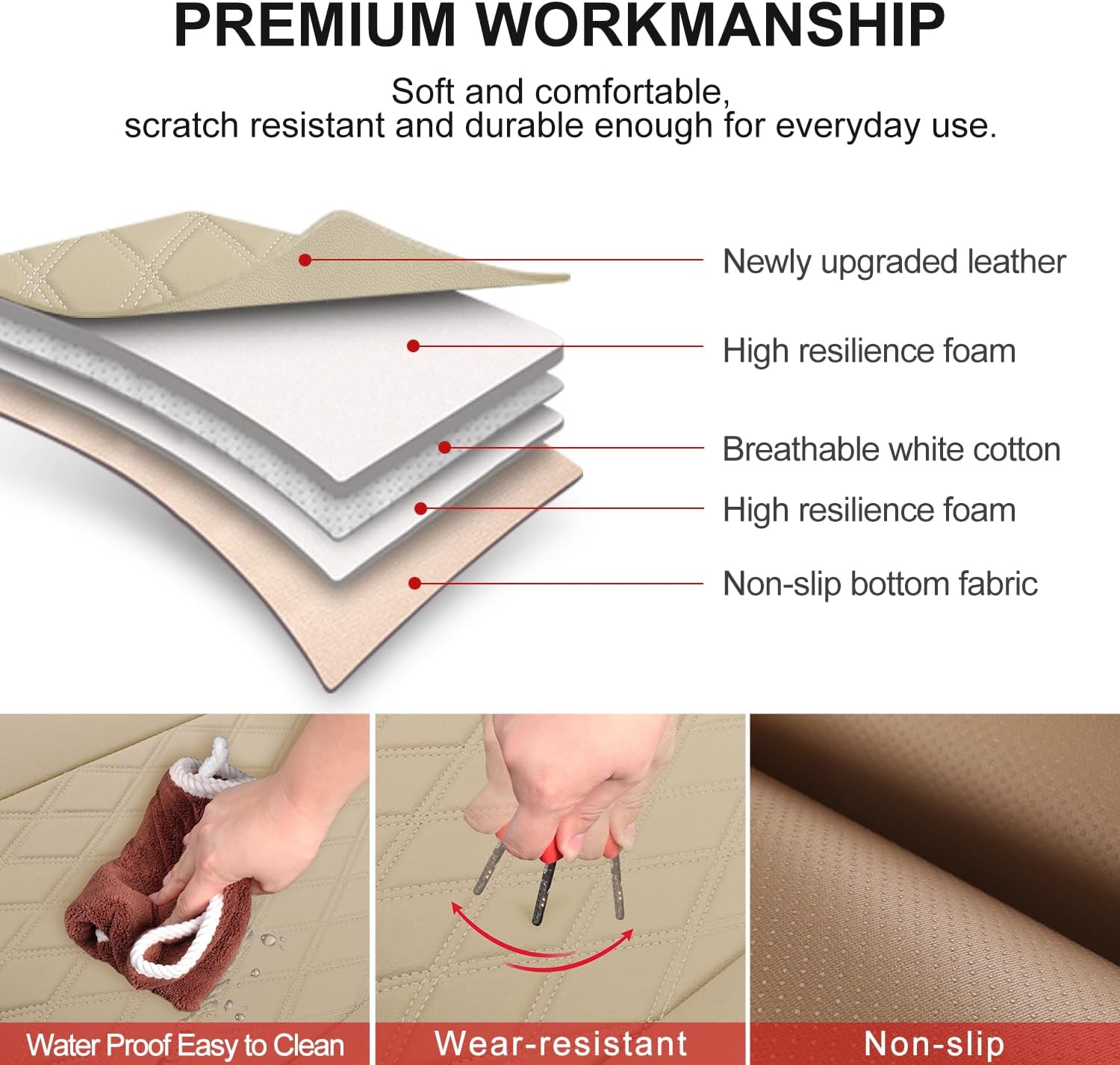 - PU Leather Soft & Durable: Our bottom seat covers for cars are made of soft PU leather, providing soft and durable protection for your car interior for long-term use. A built-in layer of elastic sponge provides maximum comfort for your hips during your driving. When the bottom car seat covers get dirty, just wipe them gently with a dry towel.