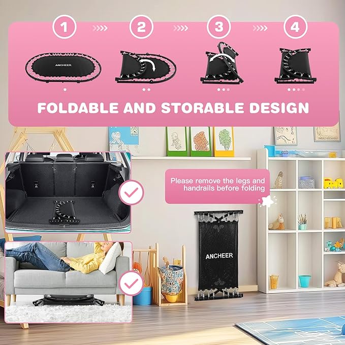 - Easy to Assemble & Foldable Design: 90% of the trampoline body is pre-installed and comes with detailed instructions and installation videos, allowing for quick installation in 20 minutes. The indoor trampoline for kids features a foldable frame design that reduces its size to just 1/3 (4.7 inches) of the original volume for easy storage, with a detachable folding mechanism that requires disassembly for compact storage.