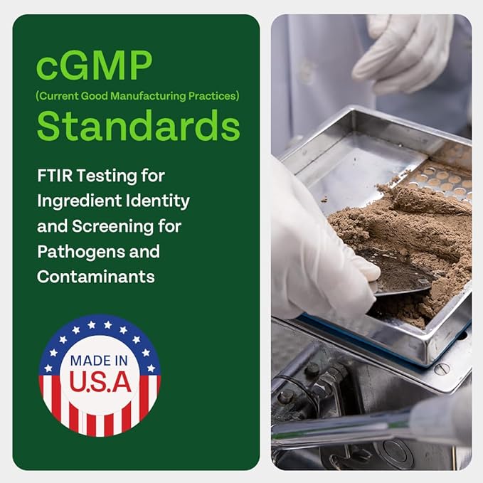 - Made in USA: We follow cGMP (Current Good Manufacturing Practices) standards and conduct assay testing to verify the potency of raw materials, FTIR testing for ingredient identity, and screening for pathogens and contaminants.