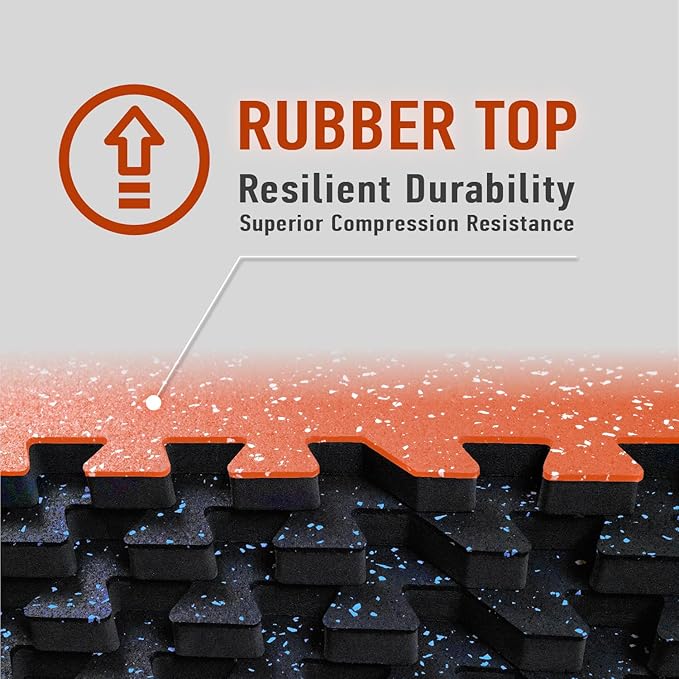 - [Upgraded Dual-Layer Design]: Concerned about your equipment scratching the floor during workouts? Our 2in1 Rubber Top EVA Foam Exercise Gym Mats are crafted to solve this issue. The textured rubber top layer, combined with a high-density EVA foam bottom layer, seamlessly creates a non-slip tough surface with excellent shock absorption.