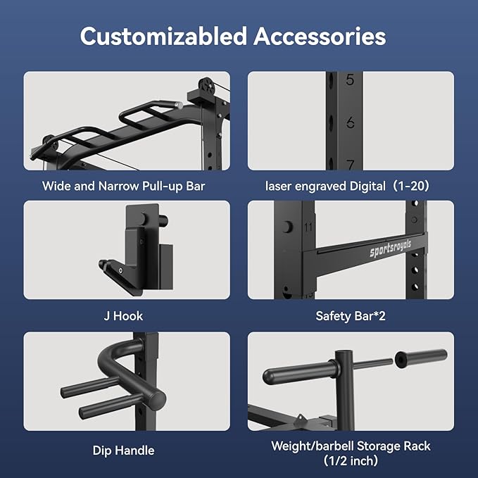 - 【Customizabled Free Accessories 】- NO NEED to buy the extra fitness accessories. All the accessories come with our Sportsroyals home gym power cage. It included: lat pull down bar*1, cable bar*1, multi-position cable handle*2, J-Hook*2, safety bar*2, wide/narrow dip bar*2, 360° landmine*1, foot board*1, battle rope ring*1, band peg*6, 1"&2" barbell clamps*2, weight plate bracket, In addition, the weight plate bracket of the cable crossover machine fits the 2" Olympic or 1" standard weight plate.