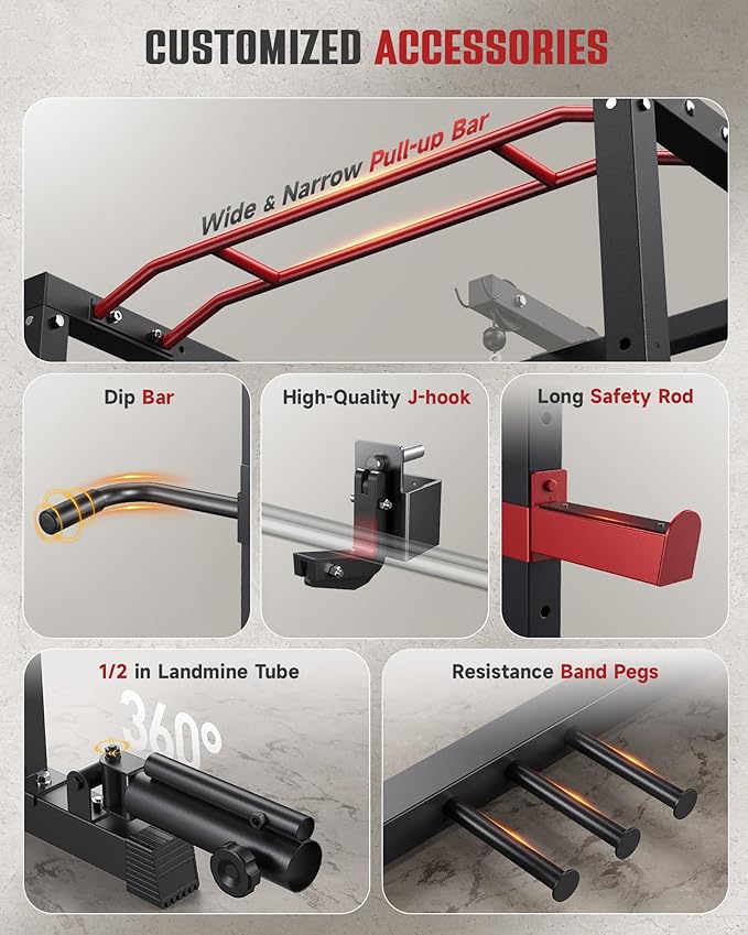 - 【Fully Equipped & Versatile】- No need to buy the extra fitness accessories. All come with Sportsroyals home gym power cage. It included: lat pull-down bar*1, cable bar*1, cable handle*2, J-Hook*2, safety frame*2, safety rod*2, wide&narrow pull-up frame, dip bar*2, 360° landmine*1, foot board*1, band peg*6, 1"&2" barbell clamps*6, In addition, the weight plate storage bracket fits the 2" Olympic or 1" standard weight plates.