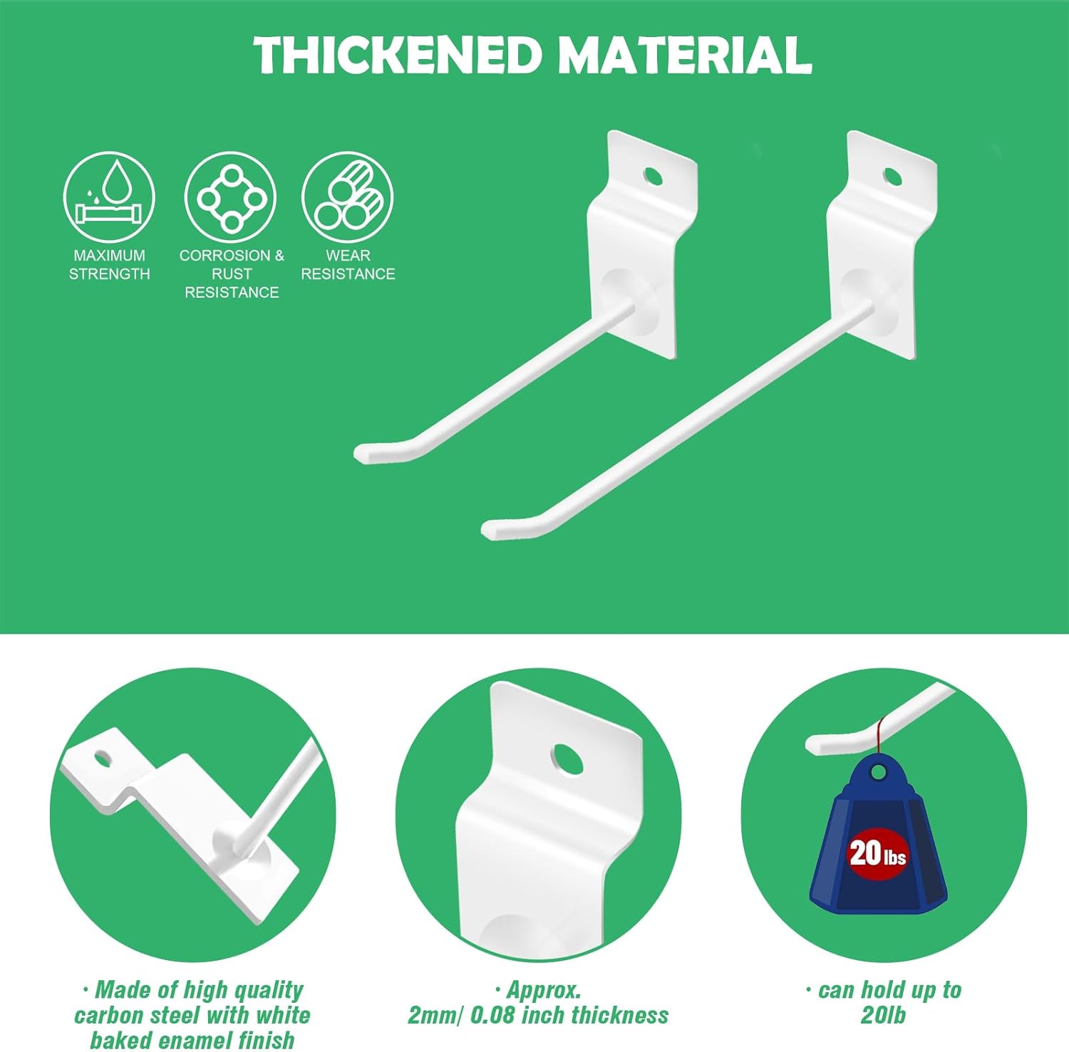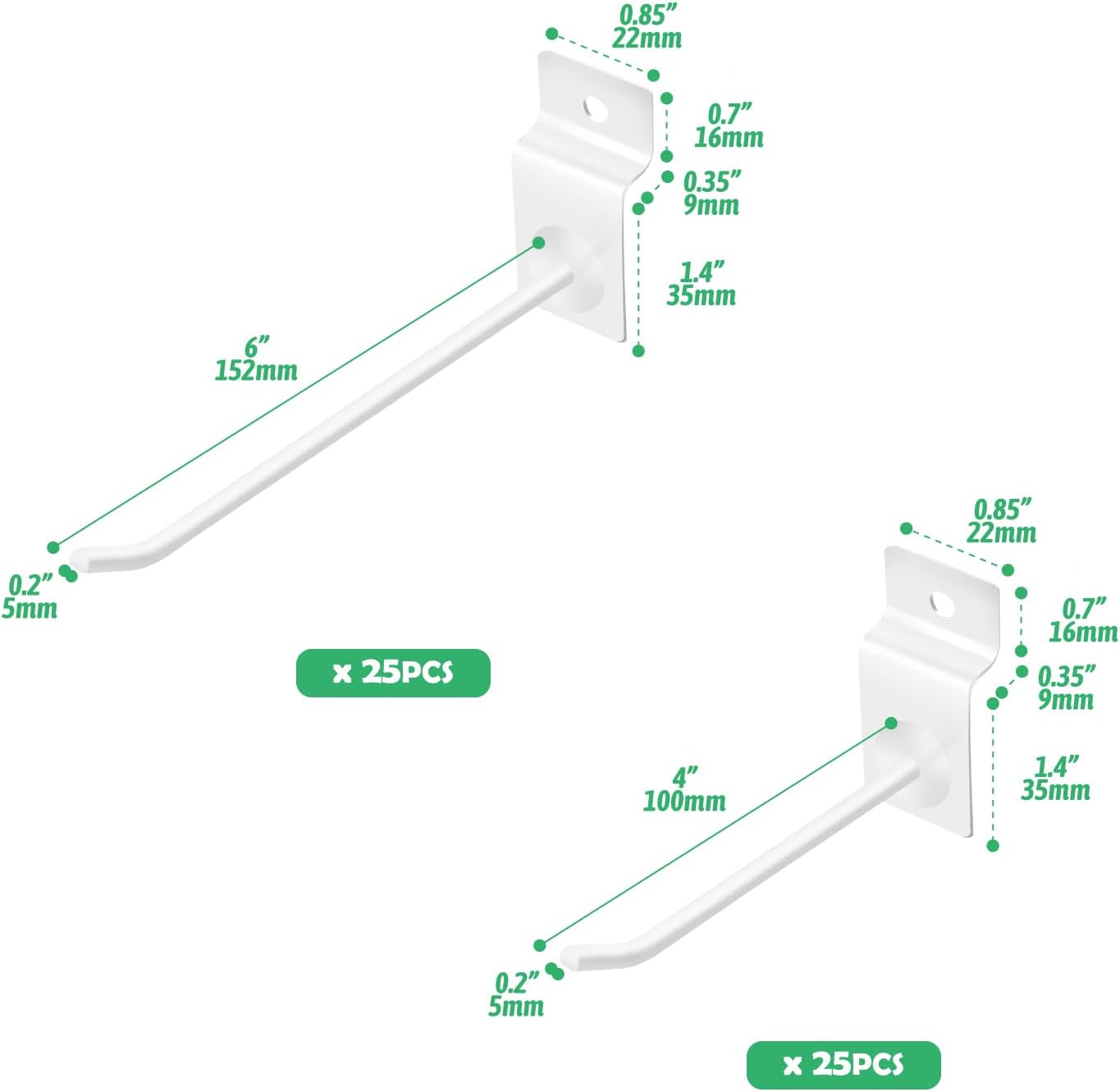 - [What you Get] The white slatwall accessories kit contains 25pcs 4”/ 10cm slatwall hanger hooks, 25pcs 6”/ 15cm slatwall hanger hooks, totally 50pcs. The nice the combination of enough quantity will meet your space planning or replacement needs.