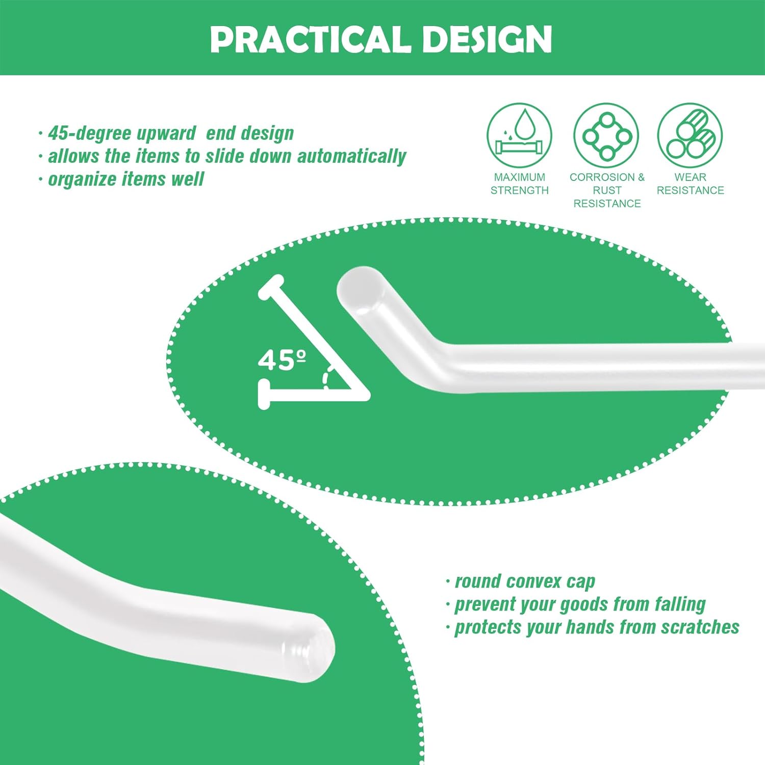 - [Aesthetic and Practical] Round convex cap prevent your goods from falling and protects your hands from scratches. The unique 45-degree upward end design allows the items to slide down automatically and and organize items well; The slat wall hooks for shelves are suitable for holding various items, firmly hold all of your retail and household needs that you may have.
