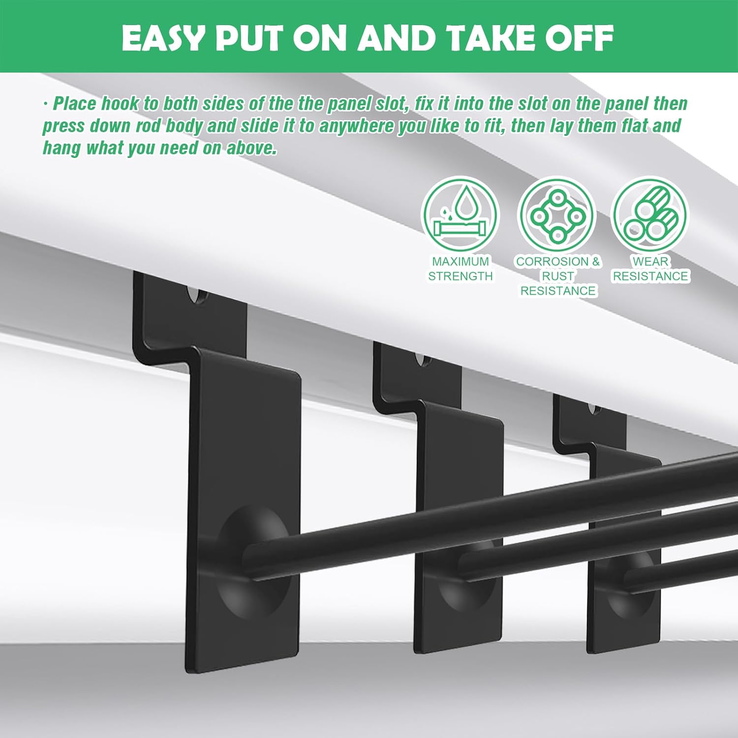 - [Easy to Use] No tools required. Fit most standard siding panels and and slat grid panels. Place hook to both sides of the the panel slot, fix it into the slot on the panel then press down rod body and slide it to anywhere you like to fit, then lay them flat and hang what you need on above. Effectively creating room for your workspace or home.