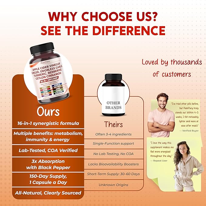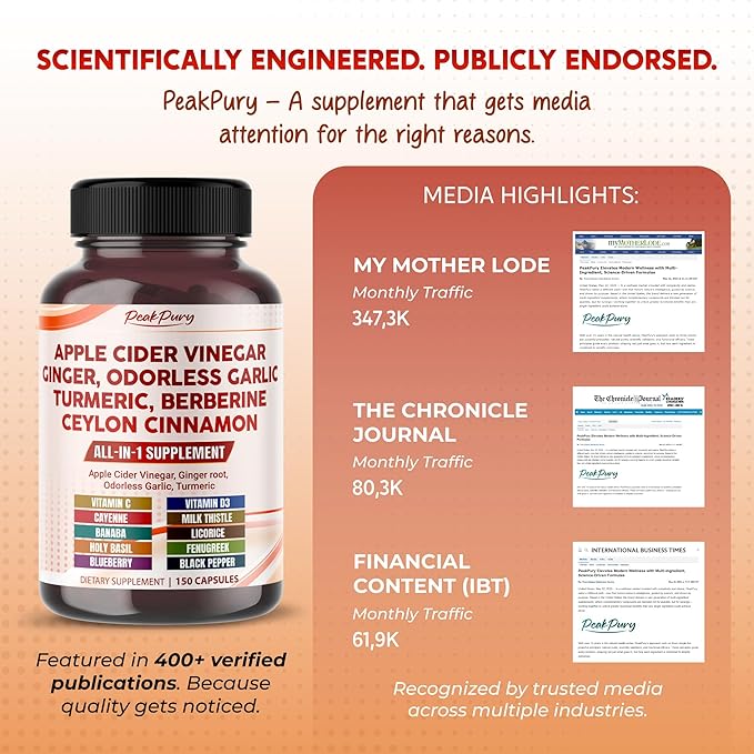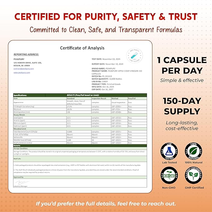 - Advanced Formula: Peakpury Supplement contains a of Apple Cider Vinegar per serving, Providing highly concentrated fresh powder in a convenient capsule for optimal support.