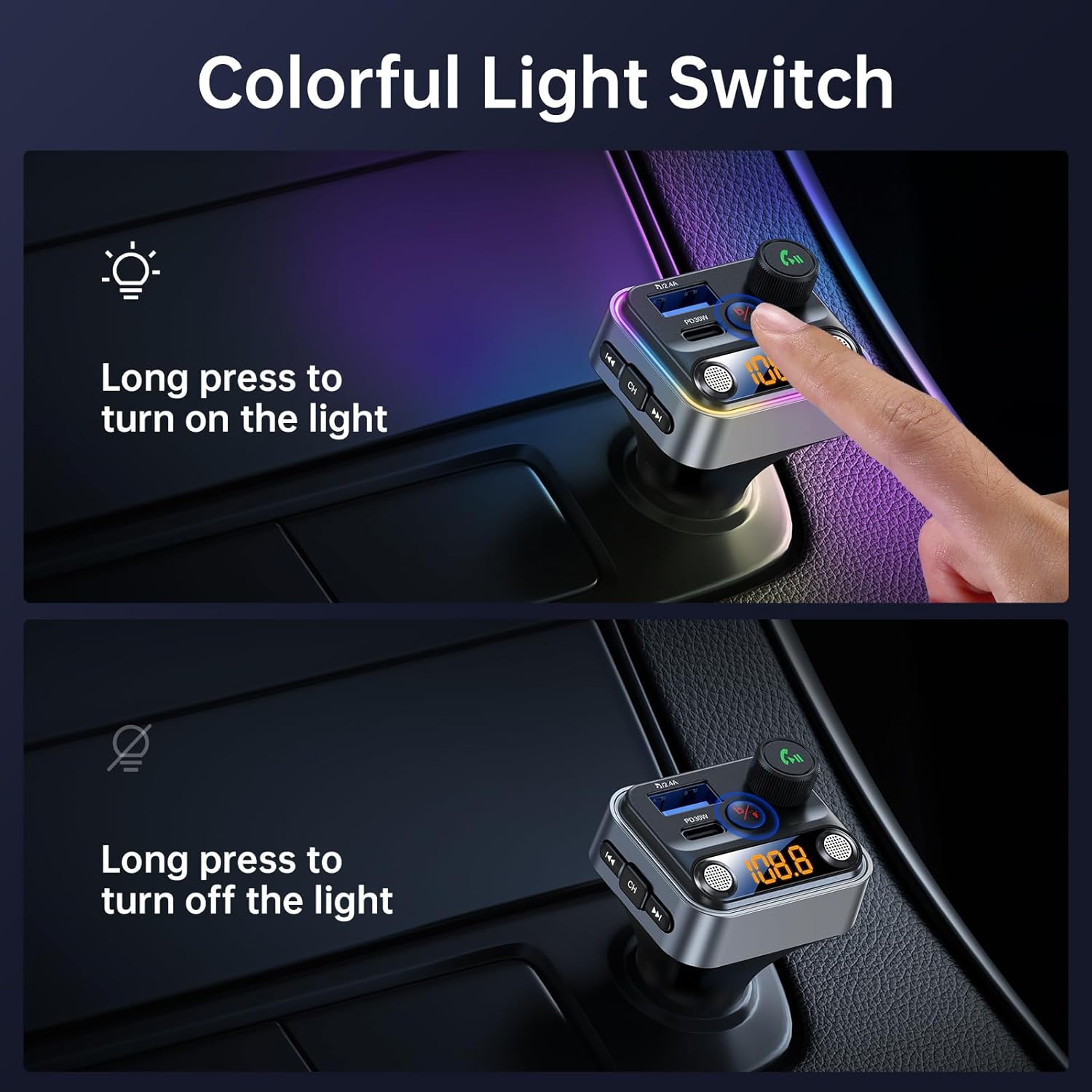 - 【Hi-Fi Deep Bass & Ambient Backlit】Just press the button "B" and you will enjoy powerful deep bass and immersive car FM radio stereo sound. The high-fidelity Hi-Fi sound quality of the transmitter will also make the music more dynamic and pleasing to the ear, elevating your musical journey to unprecedented heights.