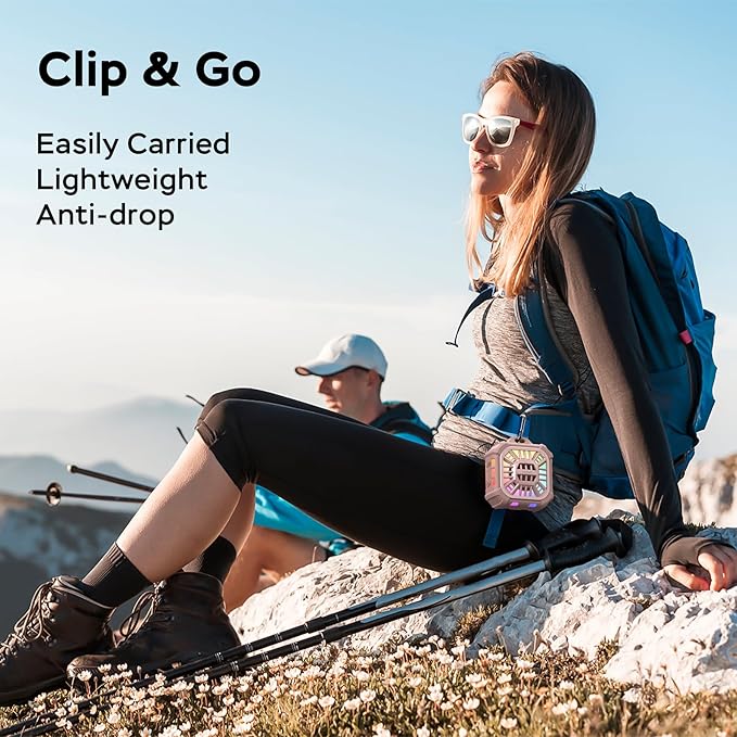 - 【Grab and Go Clip-on Speakers】 The M12 portable size speaker, crafted for ultimate portability, making it your perfect on-the-go companion. Whether you're golfing, at the beach,clip on the bag even hiking running, its compact sleek and lightweight design, complete with a convenient hook, ensures easy carrying perfectly fitting into your backpack.