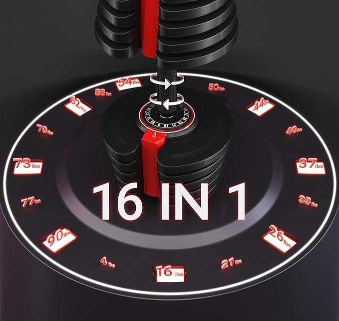 • 16-IN-1 ADJUSTABLE DUMBBELLS:This dumbbell set spans a wide weight range from 4 lb to 90 lb in diverse and smaller increments to facilitate gradual resistance, intensity, or volume adjustments.