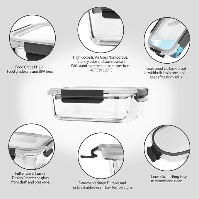 - Bpa-free & Lead-free & High-borosilicate glass & Easy to Open and Close & Easy to clean- The Glass Storage Containers are BPA Free, and made out of high-borosilicate glass for easy heating and durability. non-porous glass, Free of Harmful Chemicals.