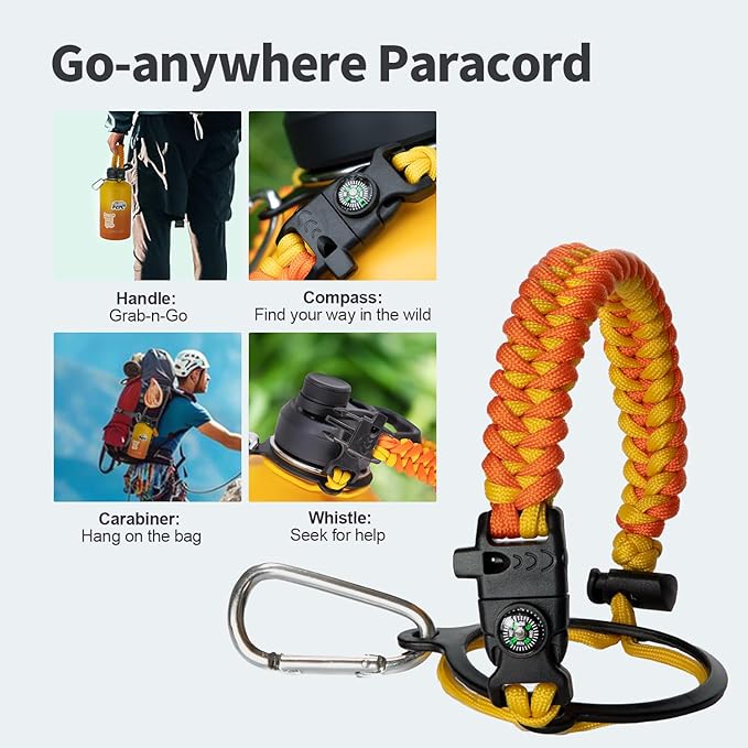 - Palm Fitting Paracord Handle: Compared to handle lids, nylon paracord on the bottle gives you more choices in terms of color coordination and coziness on your hands. Match the handle with your bottle to make a complete outdoorsy look. Compass and carabiner can be lifesavers for hiking and other expeditions