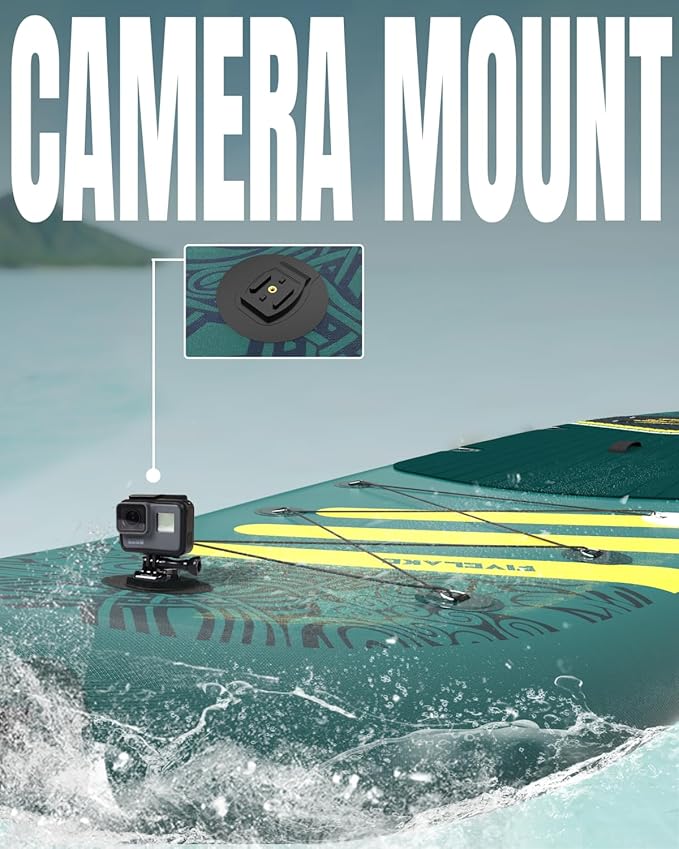 - All-Around Execllence:Featuring 6 bungee cords and extra D-rings, this board is versatile for gear, an SUP seat, or dual-use kayak paddles. It includes a camera mount and a fishing rod holder for capturing memories and enjoying peaceful fishing.