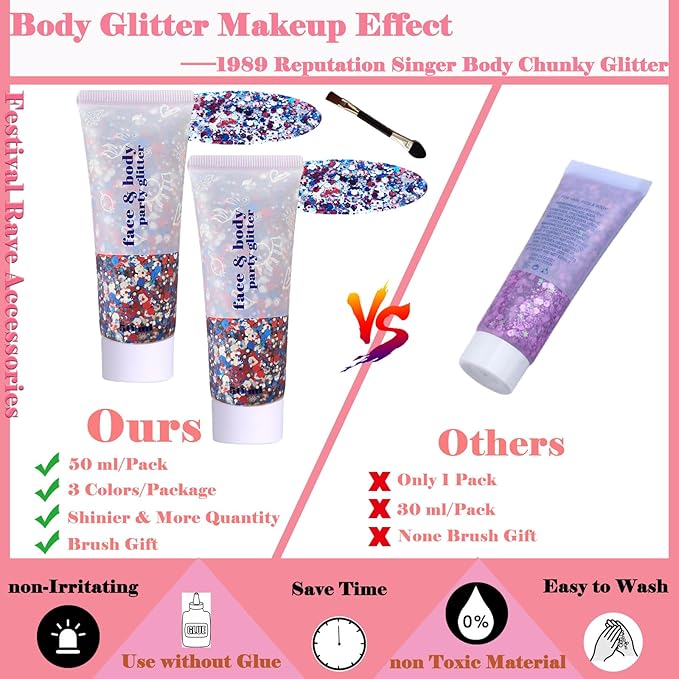 - Fourth of July Deals Accessories: This glitter gel can used as face glitter makeup,eye glitter makeup, hair glitter, cheeks, lips etc, also be suitable for parties, singer concerts, bar, wedding, performance, Halloween, Christmas, multiple occasions,as rave accessories,festival accessories,disco accessories, mermaid accessories, making your makeup more attractive and eye-catching