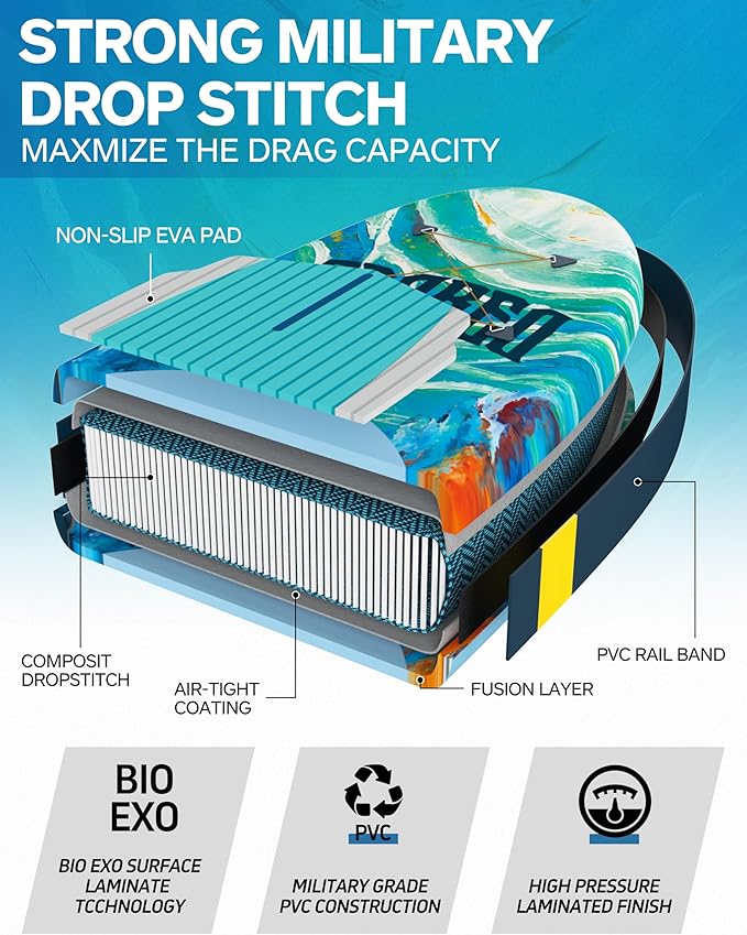 - 【Underwater World Design】Quickly inflates and deflates for portability, BOIERTO foldable inflatable paddle boards are very easy to carry and set up. BOIERTO use a High tech process to transform military-grade PVC into a rock-solid rigid platform. With a core of composite drop-stitch fibers connected to the nearly indestructible outer skin, the inflatable boards stand up to anything you want to do on the water.