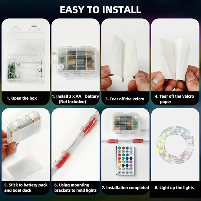 - Battery Powered Boat Lights : This lights provide 24ft battery RGB lights, Powered by 3 Pcs AA batteries (not included), very safe to use and touch, portable to anywhere and a great idea for any boats. Turn on the switch back of the battery pack, then you can enjoy the colorful boat lights at night