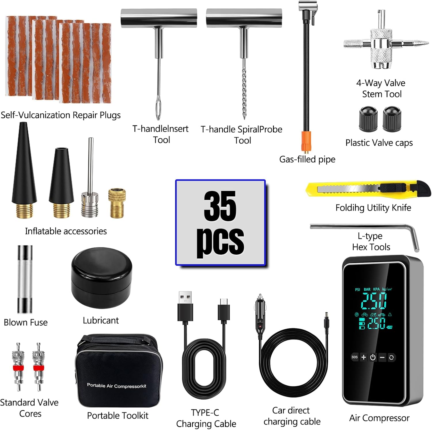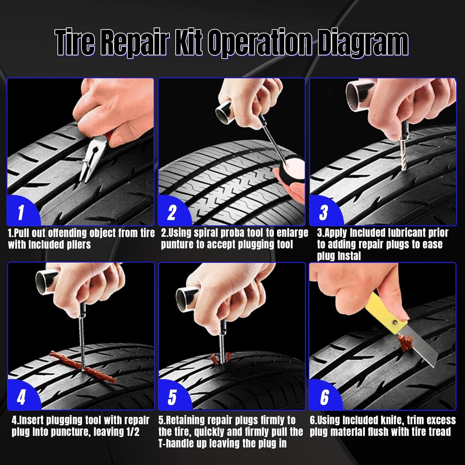 - Efficient and Convenient: This kit includes a portable air compressor and tire repair tools. In the event of a tire blowout, the can quickly fix the tire and reinflate it with the 3X Faster Inflation air compressor. Enabling you to quickly resolve the issue.