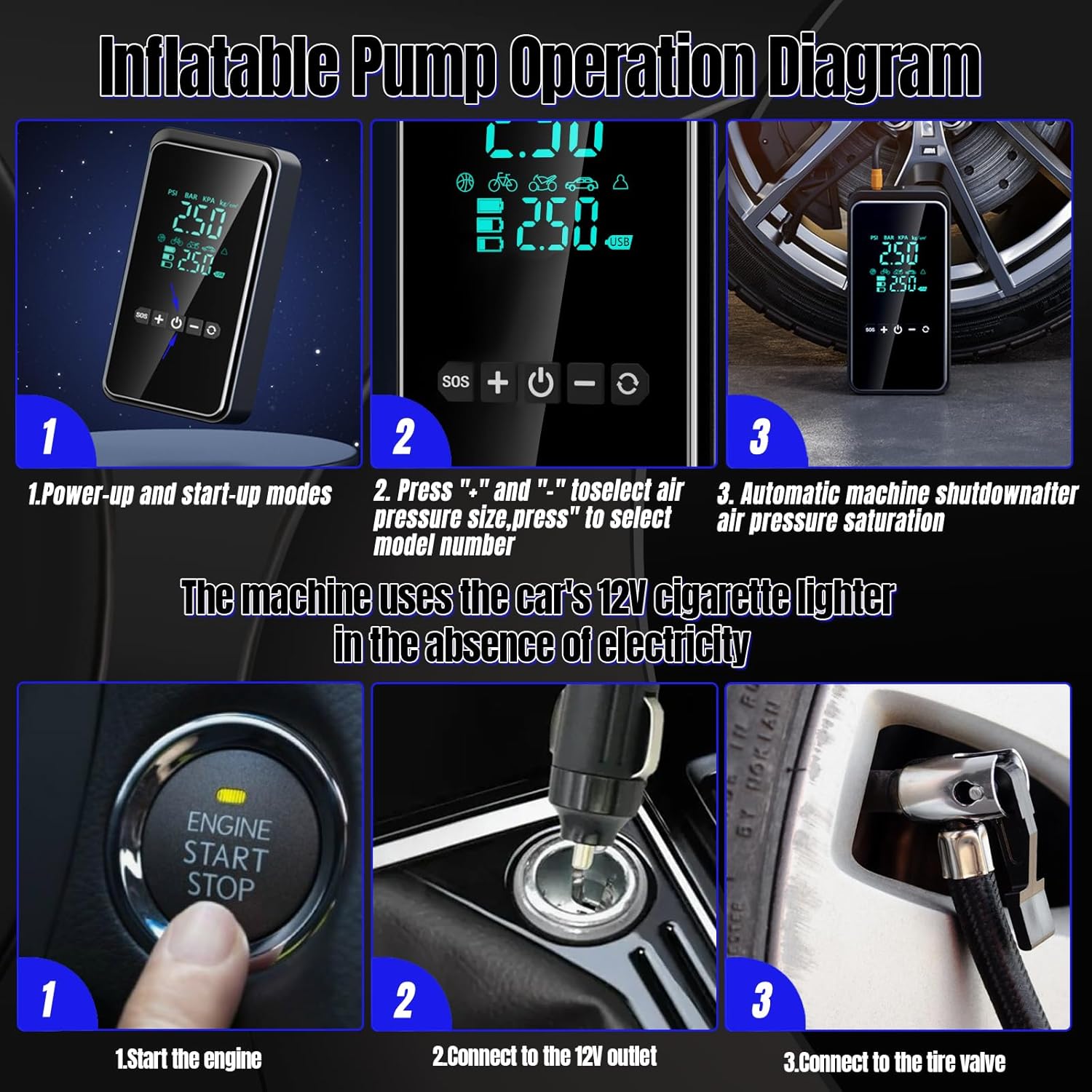 Tire Inflator Portable Air Compressor with Tire Repair Kit, 150PSI & 3X Faster Cordless Tire Pump with LCD Dual Display for Car, Bike, Motorcycle, Ball