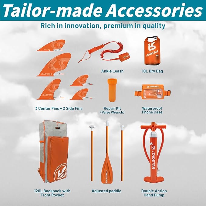 - Tailored One-Stop Accessories - Our iSUP set features more stuff than others, which include an adjustable sup paddle, 5 fins, double-action pump, ankle leash, waterproof pouch, 120L backpack, 10L dry bag, whistle, valve wrench, and manual