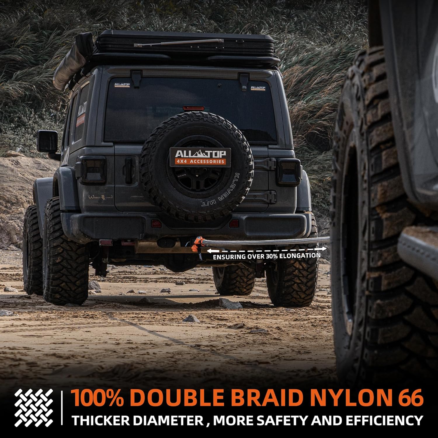 - 【RECOVERY MUST-HAVE】 ALL-TOP Kinetic Rope is one of the most reliable overlanding gear you should have to safeguard your exploring trips. Double braided with 100% Nylon N66 and coated with Mil-spec Polymers, provides trustable 48000Lbs Break Strength Rating and 16000Lbs Work Load Limit.