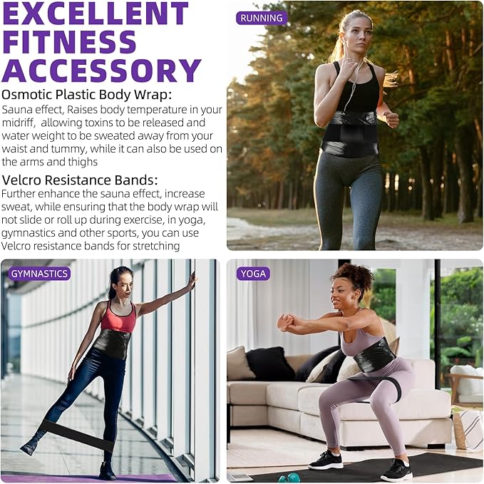 - 【Body Wrap Companion】 - The product is paired with Velcro resistance bands, which can further enhance the sauna effect. The soft resistance band will not slide or roll up during exercise, and can also be used to strengthen the muscles of the legs and hips, which can help you solve the body problem and create a beautiful figure