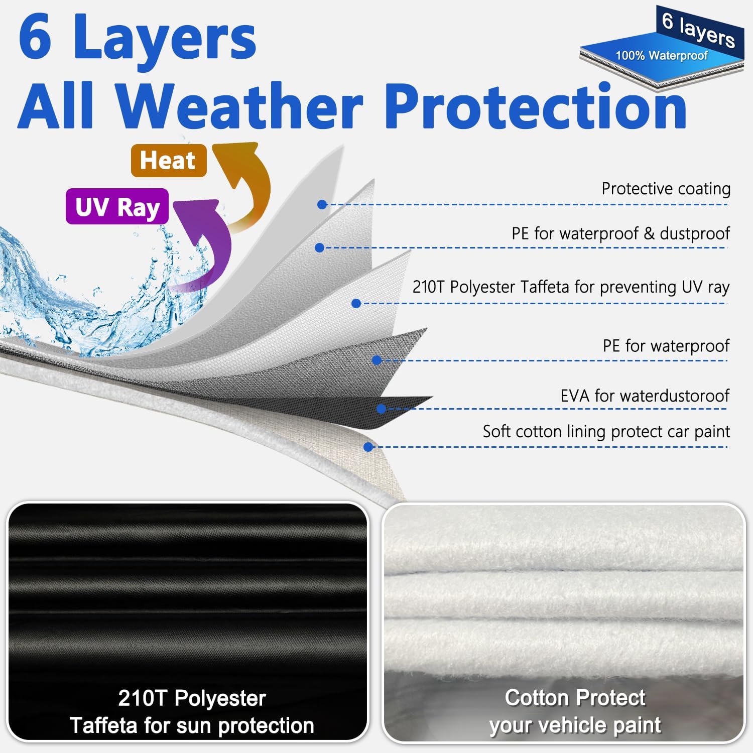 - 210T Polyester Taffeta - This car cover is made of high-density 210T Polyester Taffeta, lighter yet firmer, and withstand 2000mm water pressure so the car cover has better water resistance. The textile fabric is waterproof and heat insulation, yet air permeable and fast drying. The thicker and softer cotton will protect vehicle painting better, thickened cotton increases the fastness of the car cover and improves the ability to be tear-proof and scratch-proof.