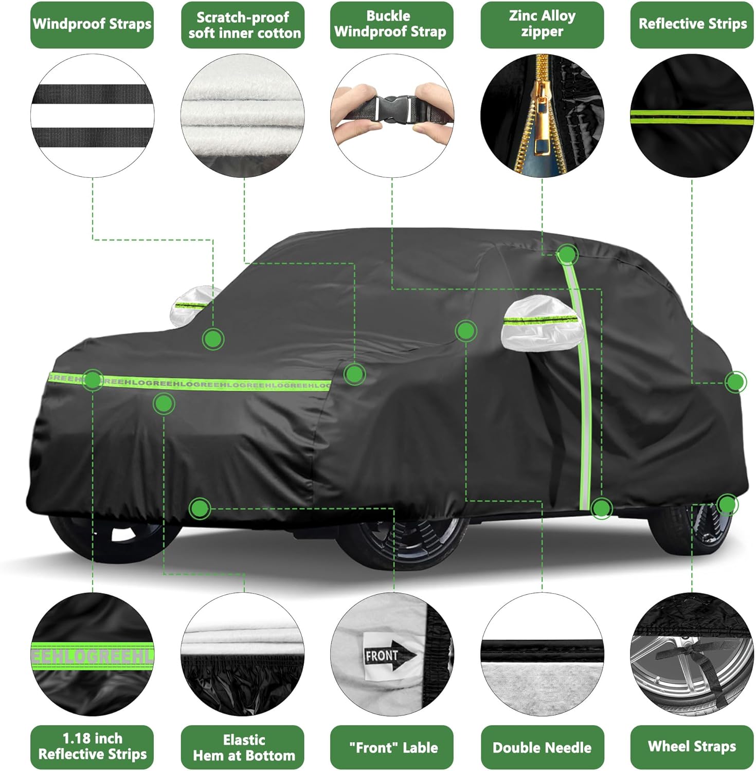 - Easy Access Zipper - ① Driver door classic zipper design for easy access and convenience while using the car cover. ② 6pcs reflective strips, Remind other people at night. ③ 2 Mirror pockets make the cover fit your vehicle better. ④ Outdoor full car cover equipped with three windproof straps at the bottom to protect your sedan car cover from blowing off on windy days. ⑤ Elastic hem ensures a custom fit and keeps the car covered securely in your car. ⑥ 2PCS antenna protection kit is included in every purchase.