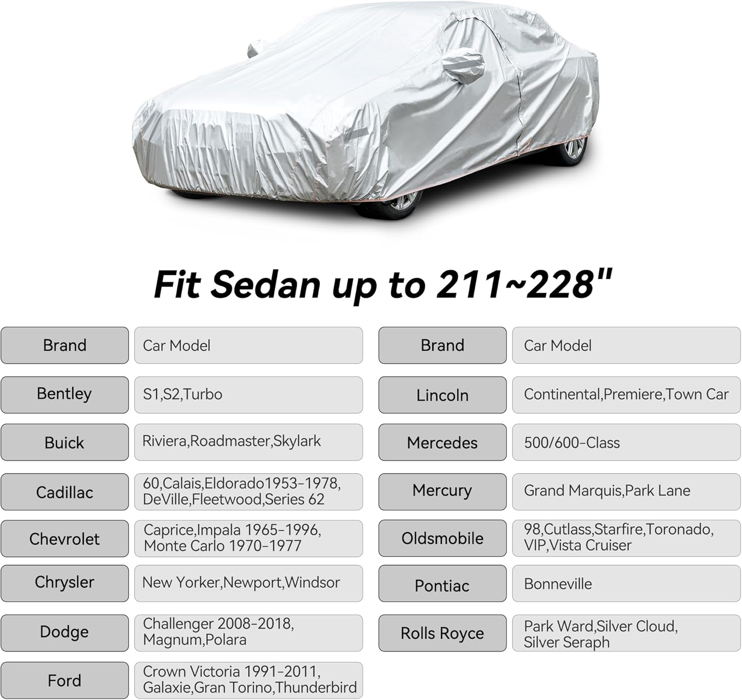 - Coverage : Full exterior coverage for sedans up to 228 inches in length, compatible with Chevrolet Caprice, Ford Crown Victoria, and Buick Roadmaster/Riviera models. Full exterior coverage for sedans up to 228 inches in length, compatible with Chevrolet Caprice, Ford Crown Victoria, and Buick Roadmaster/Riviera models.