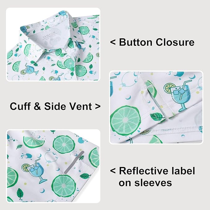 • Unique Feature: Our mens golf shirts are designed with reflective strips on both sleeve cuffs, enhancing visibility and safety during evening or nighttime activities.Stylish contrasting color elements at the side vent, add a touch of modern flair to your wardrobe.