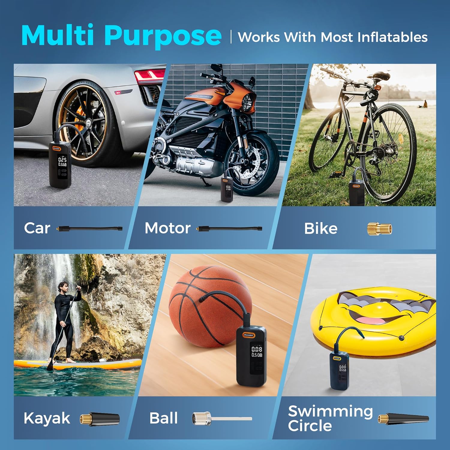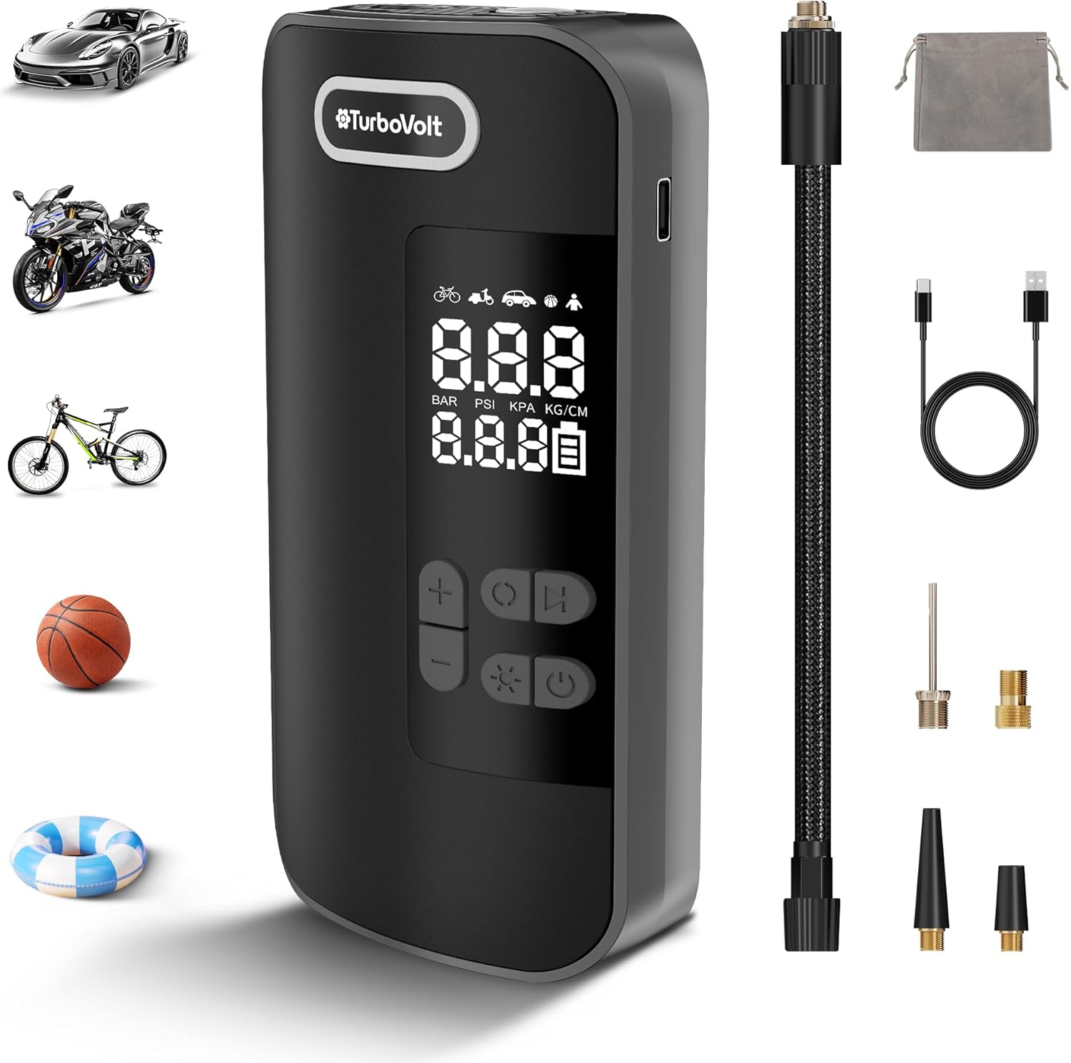 - 【Package Contents】Cordless tire inflator x1, USB-C charging cable x1, inflation tube x1, presta valve x1, ball needle x1, long air nozzle x2, accessory storage bag x1, user manual*1. 1-year quality guarantee and 24-hour customer service, if you have any questions, please feel free to contact the store for return or exchange. TurboVolt stands behind portable tire inflator for car cordless so you can purchase with confidence.
