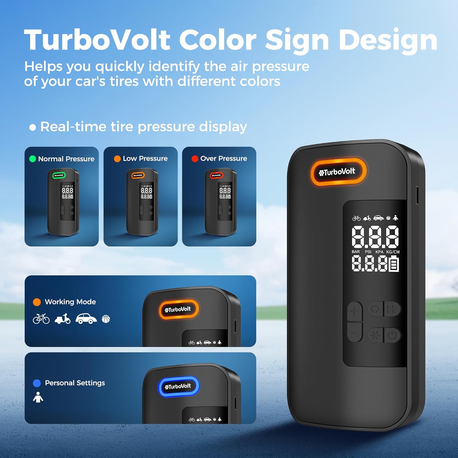 - 【Easy To Carry】Weighing under a pound, cordless design with a storage bag, this portable car tire inflator is easy to carry and store in compact spaces like cars, bicycle rack, or bags, making battery powered tire inflator ideal for emergencies, outdoor activities, or camping trips. The TurboVolt air inflator is ultra-portable, fitting easily in your glove box, backpack, or pocket.