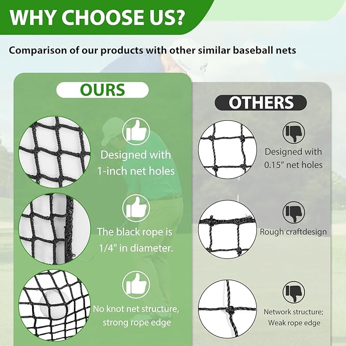 - 【High-quality Material】The baseball backstop nets is made of premium high quality Polypropylene netting material, which has strong abrasion resistance and durability.rugged durability and premium quality.Multi-sizes netting provided for different applications:10*10ft/10*15ft/10*20ft
