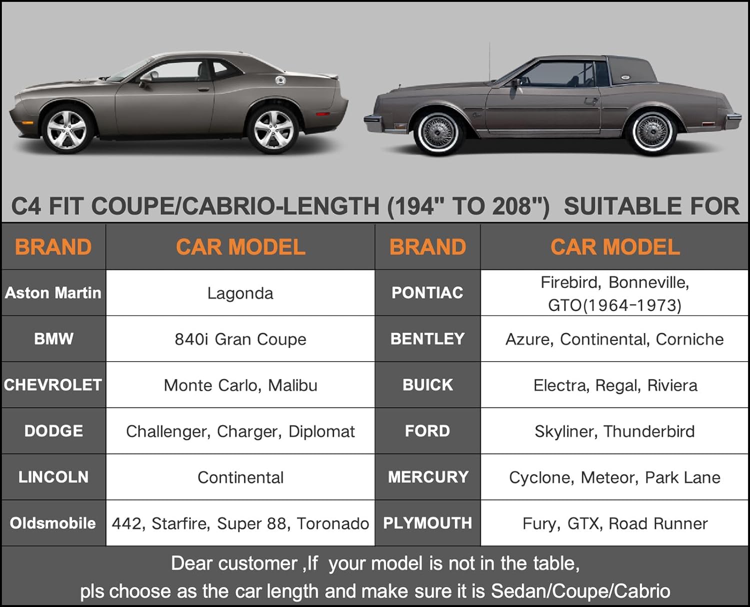 - 【Dimension C4】Universal fit for sedan/Coupe/Cabrio which length is 194-208 inch (Not for hatchback and SUV ). Suitable for Dodge Charger/Challenger, Pontiac Firebird, Trans AM, Ford Thunderbird Chevy Monte Carlo, Malibu, etc.