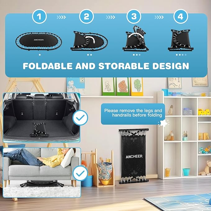- Easy to Assemble & Foldable Design: 90% of the trampoline body is pre-installed and comes with detailed instructions and installation videos, allowing for quick installation in 20 minutes. The indoor trampoline for kids uses a foldable frame design, which only takes up 1/3 (4.7 inches) of the original volume after folding for easy storage.