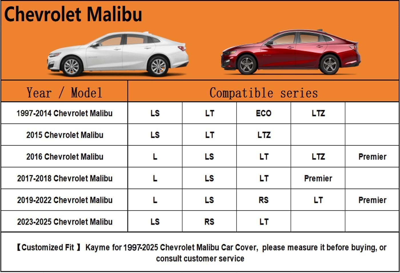 - 【Suitable for】— Custom fit for Chevrolet Chevy Malibu (1997-2025) Come with a large enough portable bag to store your cover when you do not use.