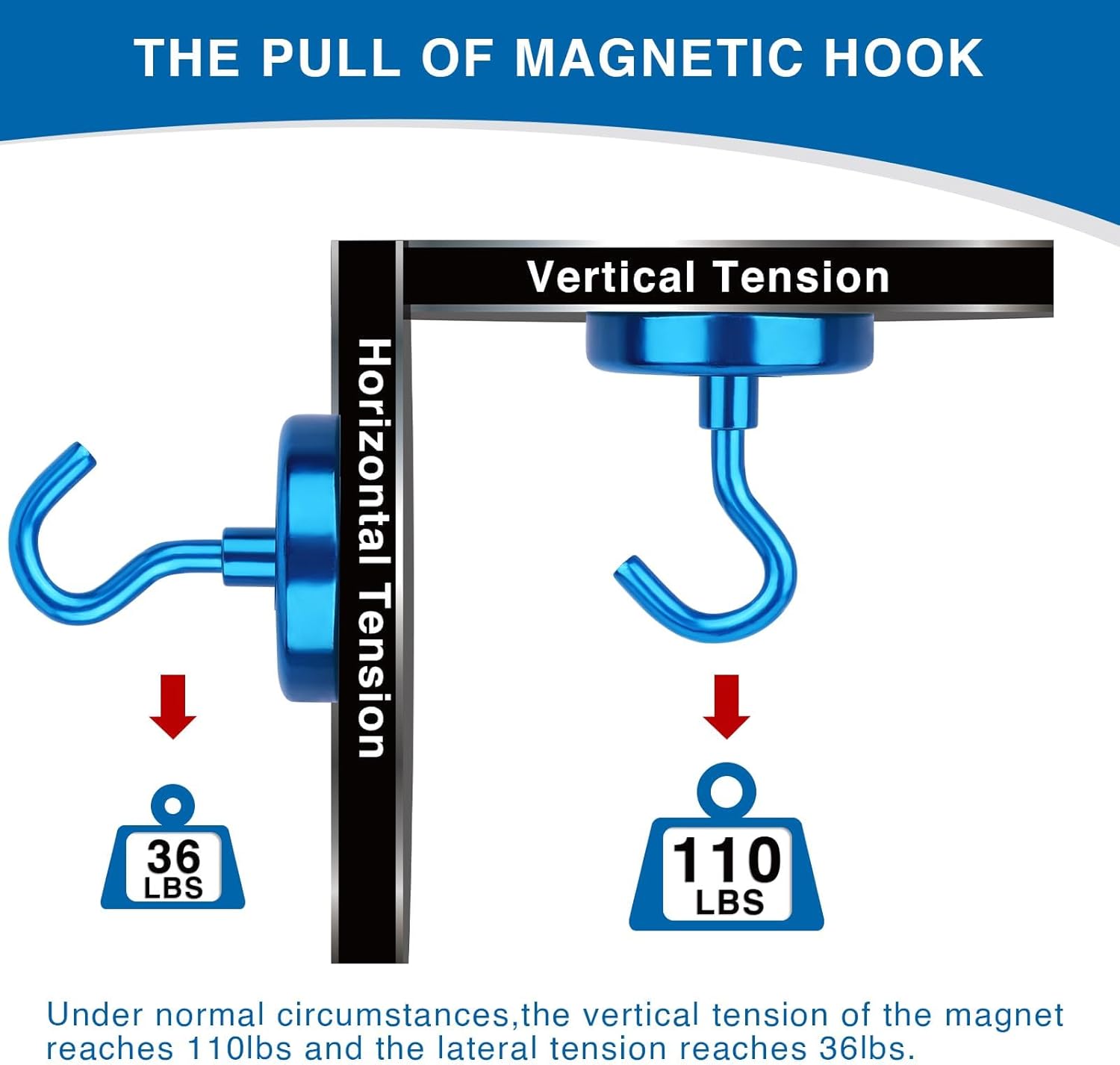 - 【BEARABLE TRACTION】 110 lbs tension of strong magnetic hook is based on the direction of tension perpendicular to the contact surface -- reduced by 2/3 if used horizontally. Please note that the tension of the magnetic hooks for hanging is also affected by the direction, the material of the contact surface and other factors.